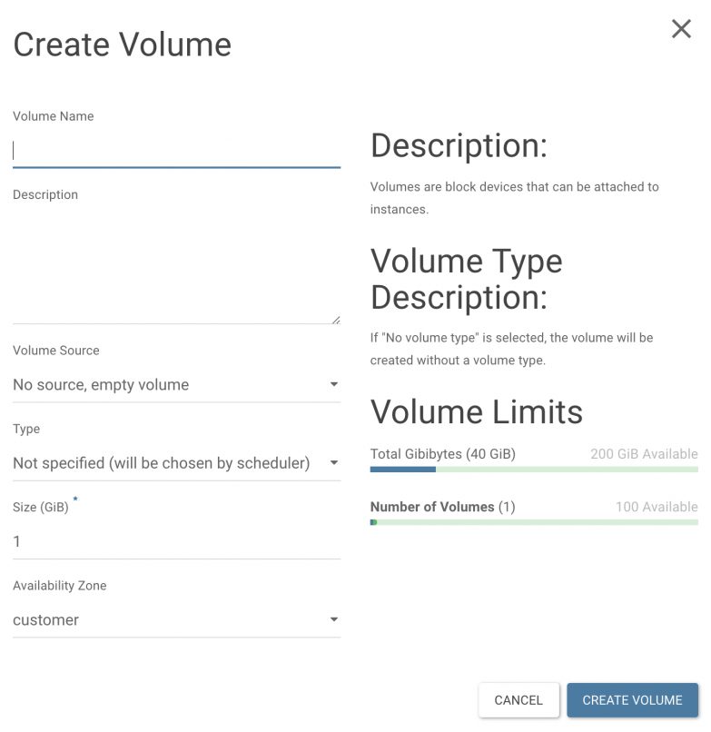 Volume je blokové diskové úložisko, ktoré sa dá pripojiť k jednej inštancii. Čiže je možné ho vo Virtuálnom dátovom centre (VDC) pridať ako ďalší disk, alebo naň priamo nainštalovať operačný systém. V prípade, že sa bude z disku zavádzať operačný systém je potrebné ho nastaviť ako bootovací.