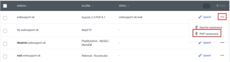 - Po kliknutí na rozšírené menu (zobrazené ako tri bodky) vyberte možnosť Nastavenia PHP
