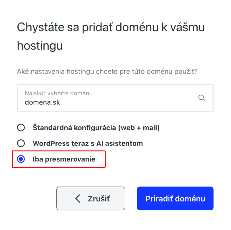 Po kliknutí na hostingovú službu sa dostanete do prehľadu hostingu, kde môžete pridať doménu zadaním názvu domény a kliknutím na tlačidlo Priradiť doménu. Zvoľte si možnosť Iba presmerovanie.