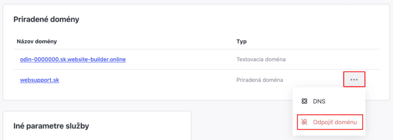 3. Na karte „Domény“ kliknite na tri bodky vedľa domény a potom na tlačidlo „Odpojiť doménu“.