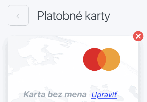 Vymazať platobnú kartu si viete tak, že poukážete myšou na konkrétnu kartu a zobrazí sa Vám biela ikona krížika v červenom krúžku (X).