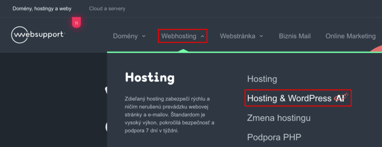 1A) Na stránke websupport.sk poukážte na hornej lište na kateģoriu Webhosting a vyberte si možnosť Hosting & WordPress AI.