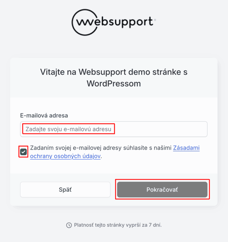 1D) Zadajte e-mailovú adresu pre využitie demo verzie WordPress, zakliknite súhlas so Zásadami ochrany osobných údajov a kliknite na tlačidlo Pokračovať.