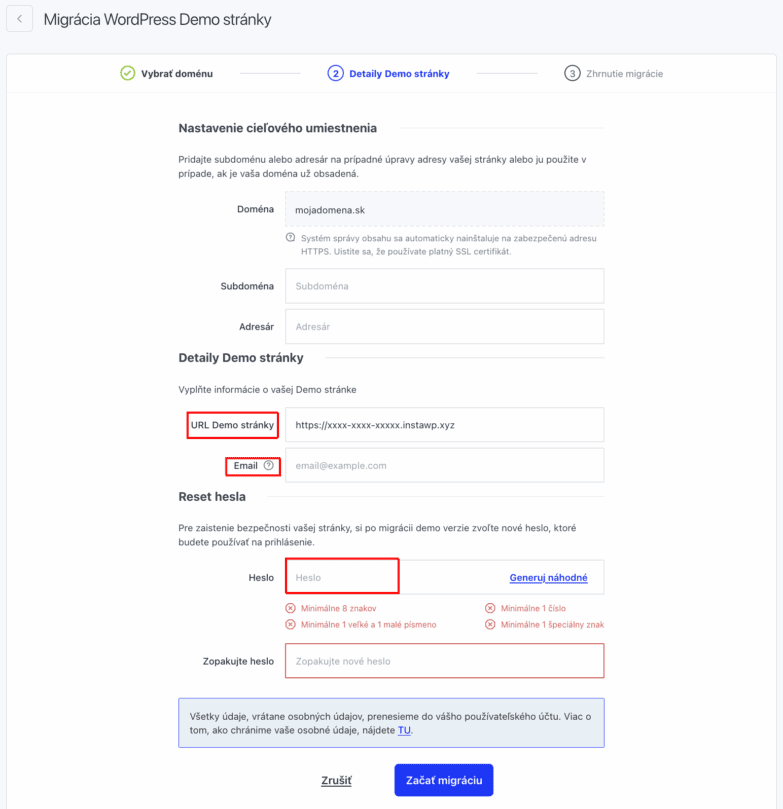 Budete presmerovaní na podstránku Migrácia WordPress Demo stránky. Výpište požadované údaje pri červených políčkach.