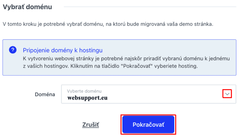 V ďalšom kroku vyberte doménu zo zoznamu a kliknite na tlačidlo Pokračovať