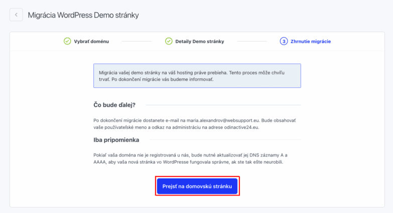 Spustila sa migrácia WordPress Demo webstránky. O výsledku budete informovaní mailom váš e-mail vo WebAdmin účte a po kliknutí na tlačidlo Prejsť na domovskú stránku budete presmerovaní na úvodnú stránku vo Webadmine