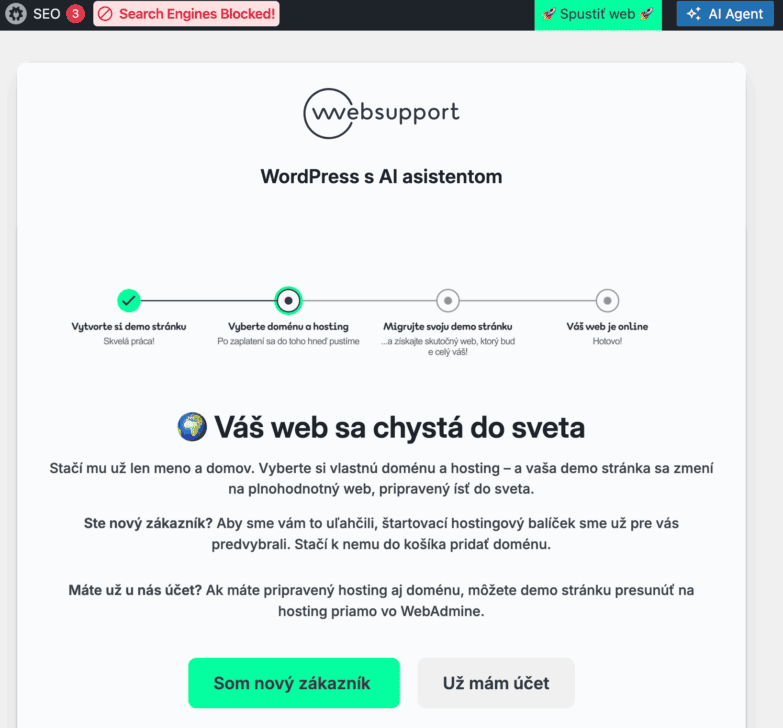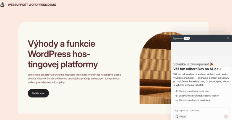 Predstavujeme vám aj úplne novú funkciu – migráciu WordPress demo stránky s AI asistentom. Stačí pár kliknutí a celý obsah z testovacieho prostredia jednoducho presuniete na svoju doménu, kde môžete ďalej budovať svoj finálny web.