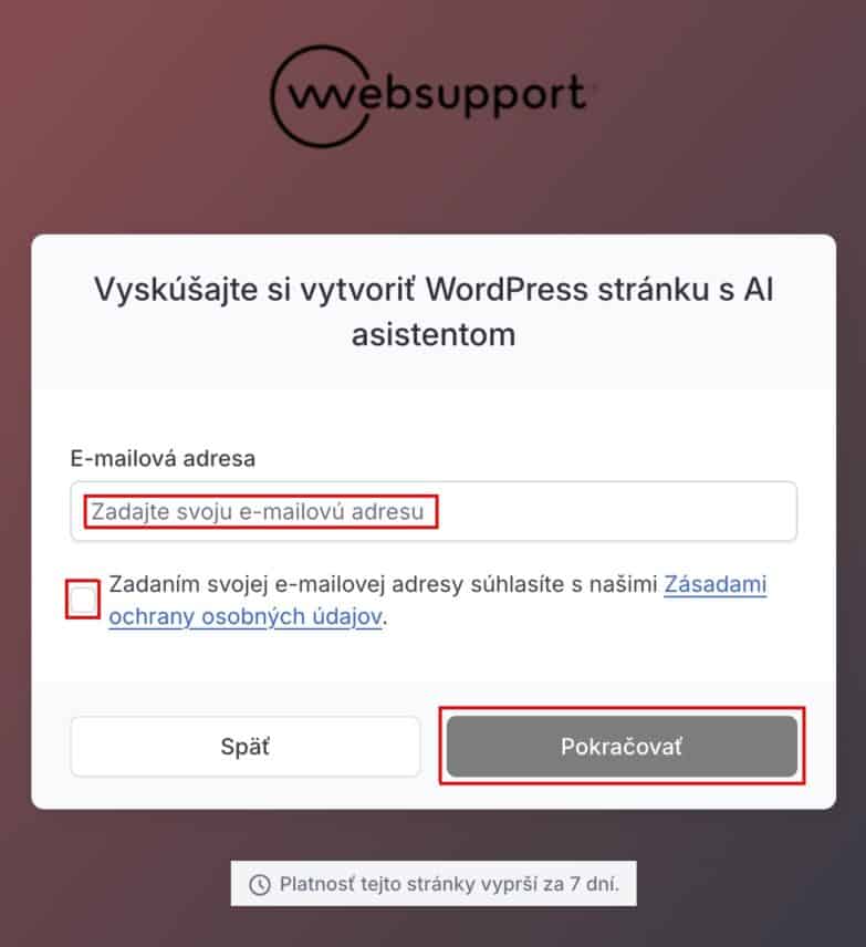 1D) Zadajte e-mailovú adresu pre využitie demo verzie WordPress, zakliknite súhlas so Zásadami ochrany osobných údajov a kliknite na tlačidlo Pokračovať.