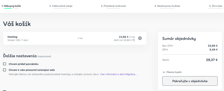 Budete presmerovaný na zakúpenie si hostingu a domény, kde si zadáte objednávku a vytvoríte si účet vo Websupport.