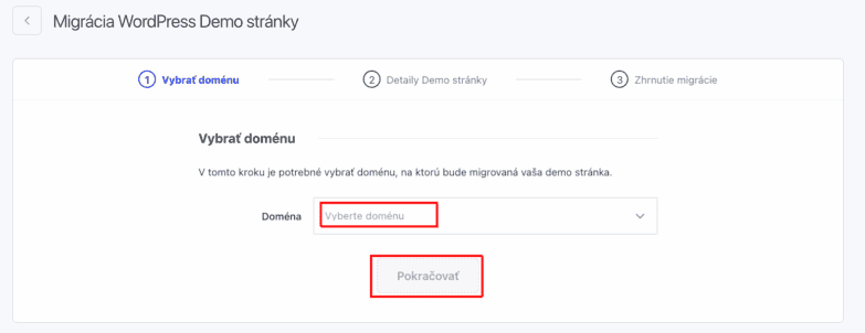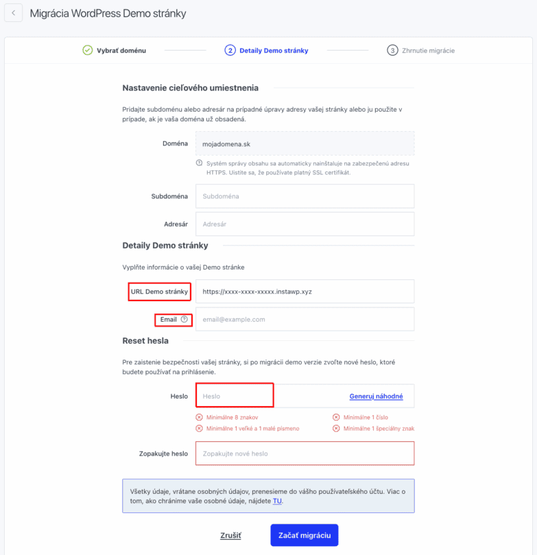 Následne budete presmerovaní na podstránku Migrácia demo stránky WordPress. Vyplňte požadované informácie v červených poliach.