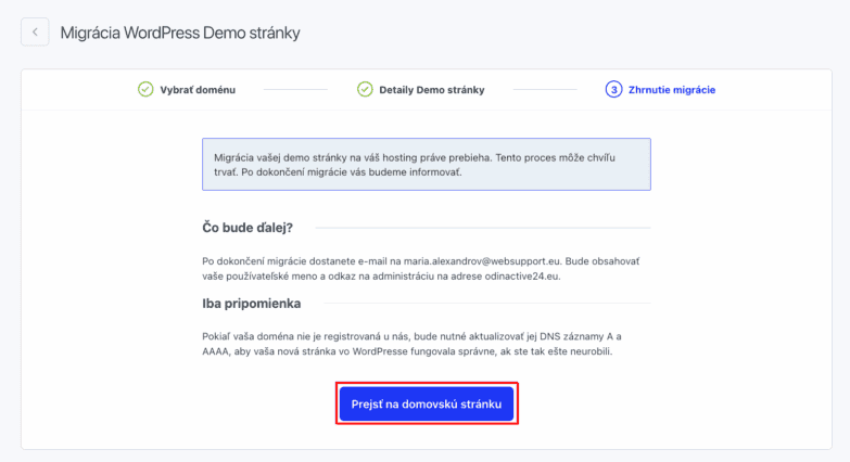 Migrácia demo stránky WordPress bola spustená. O výsledku budete informovaní e-mailom na váš účet WebAdmin a po kliknutí na tlačidlo Prejsť na domovskú stránku budete presmerovaní na domovskú stránku v WebAdmin.