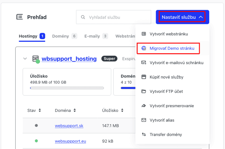 3) Vyberte možnosť Migrovať demo stránku; táto možnosť sa zobrazí, ak máte vo svojom účte aktívny hosting.