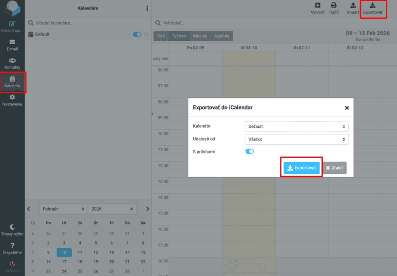- V novom okne si zvoľte, ktorý kalendár si želáte exportovať, v akom rozsahu a či má obsahovať aj prílohy