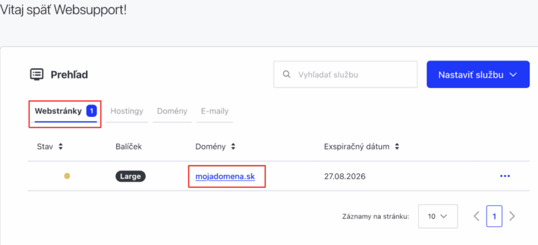 Pokiaľ už službu máte, je potrebné prihlásiť sa do administrátorského rozhrania WebAdmin. Následne prejdite do sekcie Webstránky v prehľade a kliknite na názov stránky.