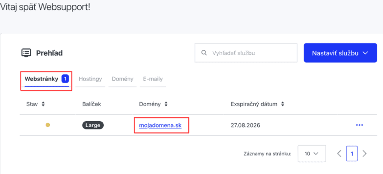 Ak chcete získať prístup k svojej stránke v nástroji Website Builder, musíte sa prihlásiť do administrátorského rozhrania WebAdmin. Po prihlásení prejdite do sekcie Webstránky v prehľade a kliknite na názov stránky.