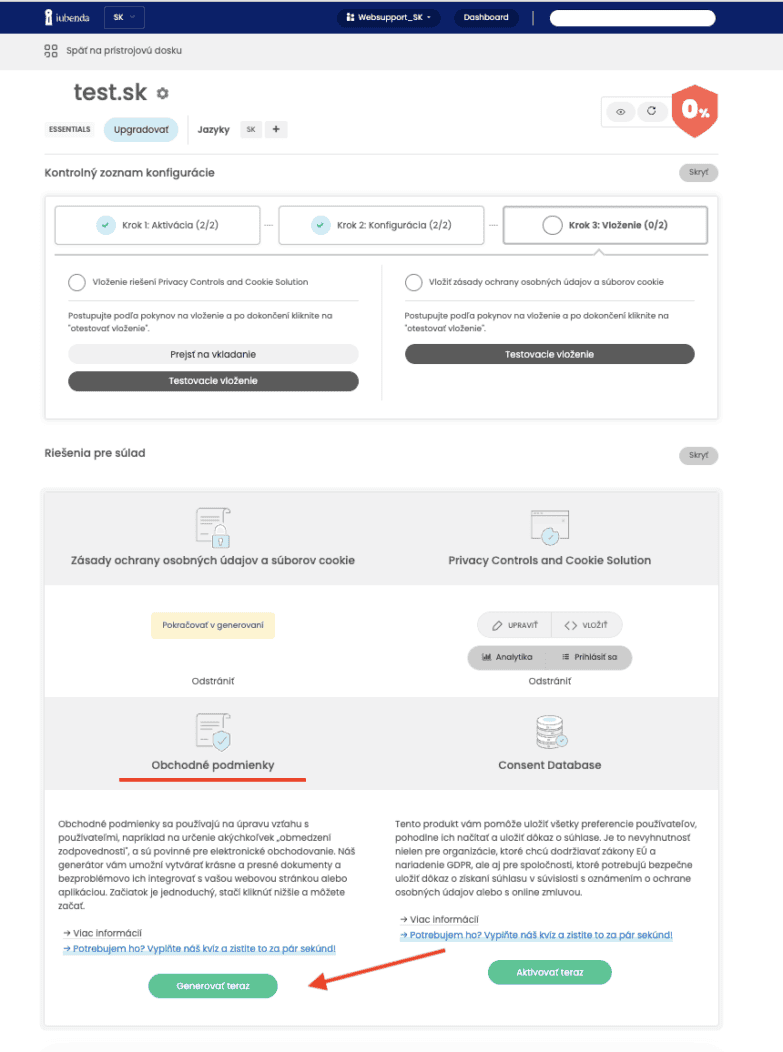 V sekcii „Obchodné podmienky“ kliknite na zelené tlačidlo „Generovať teraz“.