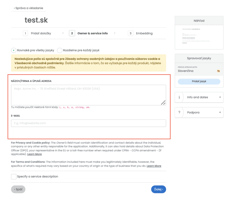 Tu budete musieť zadať právne platné obchodné a/alebo kontaktné údaje.