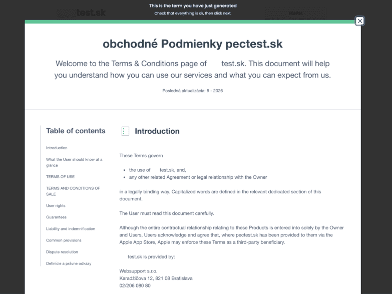 Tým sa zobrazí hotový dokument s Obchodnými podmienkami.