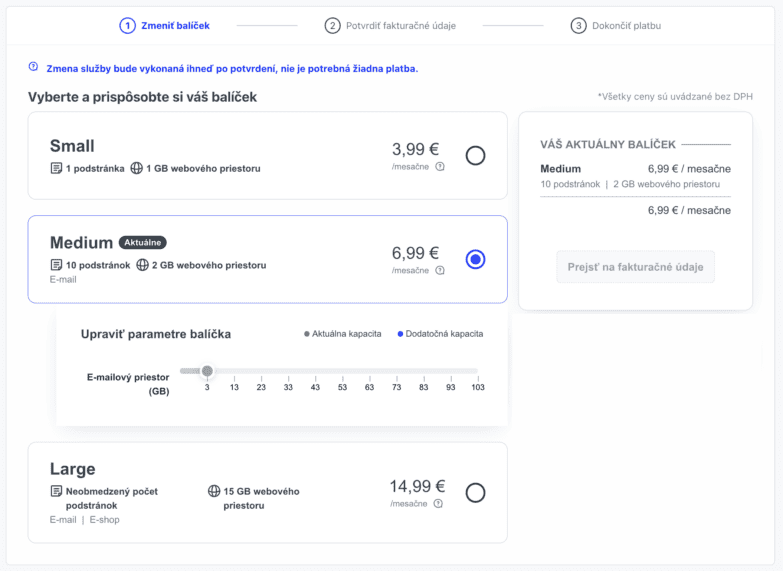 4. Vyberte požadovaný balík a pokračujte kliknutím na „Prejsť na fakturačné údaje“.