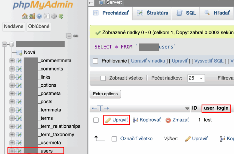 Návod pre mierne pokročilýchAk máte prístup do databázy, ktorú používa WordPress, môžete zmeniť heslo alebo aj dokonca prihlasovacie meno priamo v databázových tabuľkách MySQL alebo MariaDB prostredníctvom rozhrania phpMyAdmin.